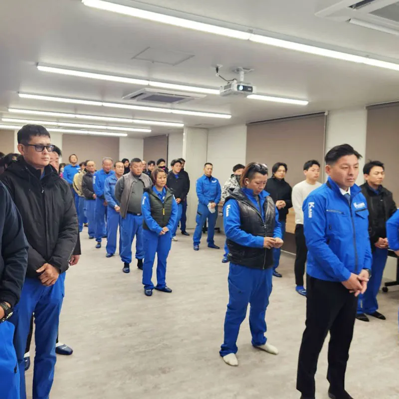新しく開設した「神ラボ」(松山市上高野町)で行われた全体朝礼では、三神社長より新年の訓示があり、「安全第一を最優先に、細かなKY活動日誌を作成し、作業員全員が業務の見える化をしよう」「一つひとつの現場に責任と誇りを持って効率よく取り組もう」という力強い言葉が社員に向け伝えられました。